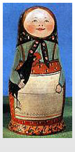 100- летний юбилей Н.В. Гоголя в 1909 году так же был отмечен появлением серии матрешек, изображавших героев его произведений. Нередко создавались и этнографические образы, делавшиеся по эскизам художников – профессионалов и достоверно отражавшие характерные черты и детали традиционной одежды Прибалтики, крайнего Севера и других регионов. Восстановить и перечислить все возможные образы, рождавшиеся в то время в домашних мастерских Сергиевого Посада, просто невозможно, как невозможно описать и проиллюстрировать все модификации товарных куколок и укладок, произведенных в так называемый “земский” период существования промысла.