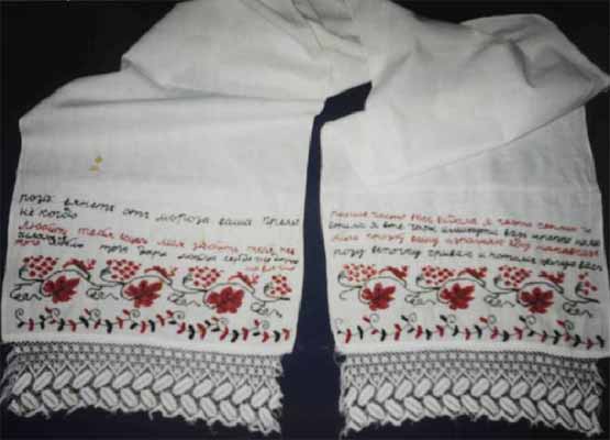 Иногда вышивка сопровождалась словами: «умывайся белехонько, утирайся сухохонько». На одном из полотенец нашей коллекции вышиты такие слова: «роза вянет от мороза, ваша прелесть – никогда», «вашу просьбу исполняю, еду на Кавказ, розу-веточку срываю и потом целую вас» (фото 5).