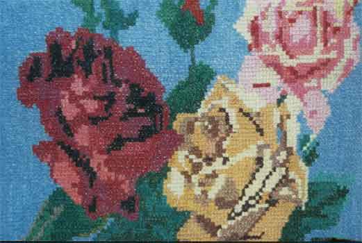 Вот перед нами пышный букет цветов в вазе, представленный в ярких, сочных красках. Это работа Минюхиной Лидии Васильевны из деревни Полутово. Такое панно может украсить не только деревенскую избу, а и современную гостиную комнату.