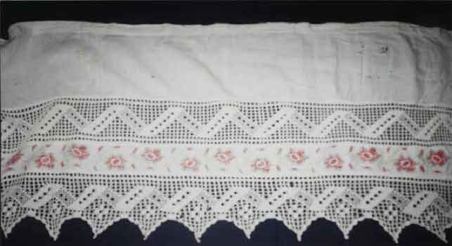 В музее представлены работы Лысцевой Галины Ивановны из деревни Королево. Она же поделилась с нами своими воспоминаниями о том, как каждую девочку в деревне учили вышивать крестиком по канве и гладью, вязать прошвы. По количеству вывязанных прошв, по вещам, украшенным вышивкой, кружевом, судили о девушке как о невесте и будущей хозяйке.
