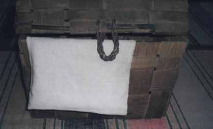 Одной из важных деталей станка является челнок с берестяной чивцой, на которой намотана уточная нить. На чивцу пряжу наматывают с тюриков, при этом используют скально.