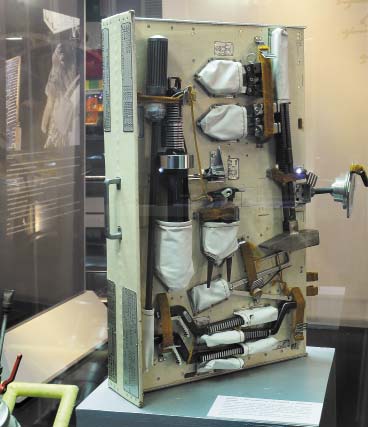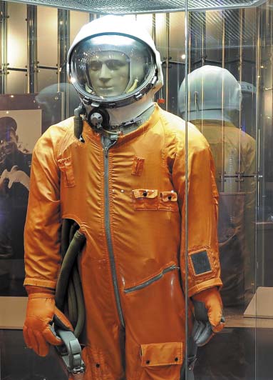 Скафандр оранжевого цвета, поскольку так спасатели смогут быстрее обнаружить космонавта после посадки. А рядом находится шлюзовая камера, через которую Алексей Леонов совершил первый выход в открытый космос, и скафандр «Беркут», который был на нем надет.