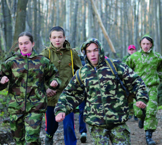 Затем ребят ждала небольшая поляна со множеством веревочных снарядов. Участникам предстояло преодолеть «бабочку», растянутую на двух деревьях, залезть по верёвочной лестнице на верхушку небольшого дерева и спрыгнуть на землю, пройти веревочную лестницу, растянутую над землёй, не задев колокольчик, привязанный к верёвке, пролезть в чрезвычайно узкую щель, образованную несколькими верёвками, и затем переползти по веревке, используя только руки и ноги, с одного дерева на другое. На себе ребята несли оружие либо
