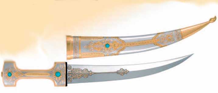 Тема авторского ножа «Тамерлан» навеяна богатейшим культурным наследием народов Востока. Изысканно украшенный нож олицетворяет власть, успех и процветание владельца. В равной степени нож достоин занять место как в коллекции художественного оружия, так и на поясе знатного охотника.