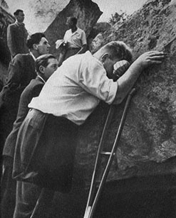 У него нет ноги, и рядом к камню прислонён костыль.