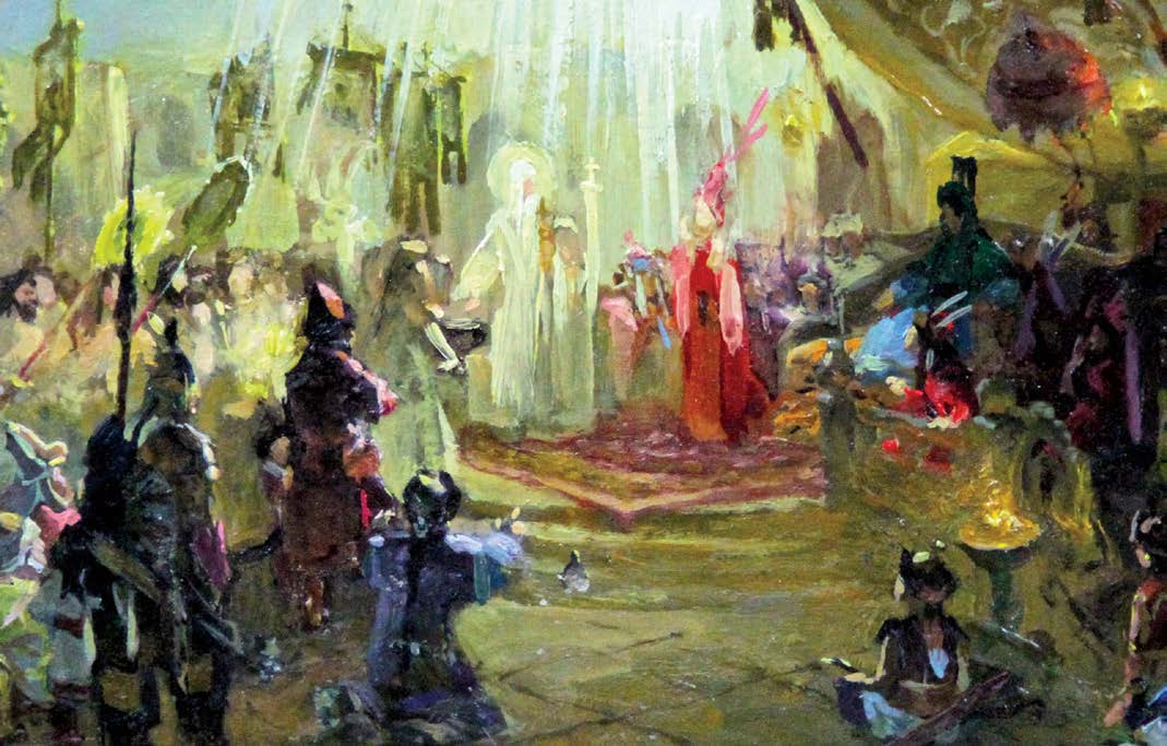 Тайдула увидела сон, что Алексий идёт, и повелела приготовить одежды по всем христианским канонам, чтобы переодеть посланников после дальней дороги, чтобы они перед ханом предстали в подобающем виде. Когда Алексий пришел в Орду, хан его встретил как самого близкого друга. Алексий возжёг малую свечу и провёл службу, окропив Тайдулу святой водой. И она у всех на глазах прозрела, открыв очи, к великому удивлению присутствующих. А там собралось большое представительство — Сарай-Берке был крупным торговым центром, было множество разного народа. На картине видно, что и китайцы (один из них в очках), и маньчжуры, буряты, монголы, тюрки, персы, русские и другие представители разных народов стали свидетелями чуда.