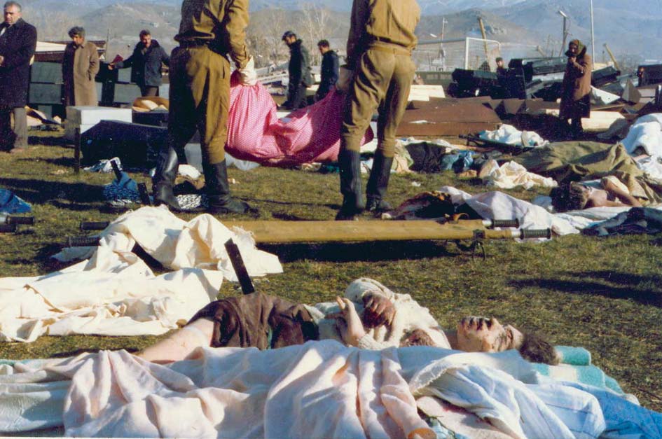 На штабном «уазике» выехали на тёмные улицы Ленинакана. Через мокрое лобовое стекло было заметно, как по бетонному крошеву разрушенных домов ползают серые фигурки спасателей. В лучах прожекторов мощные стрелы подъёмных кранов, плиты, арматура, пыль. Почти у каждого дома штабелями пустые гробы: красные и чёрные.