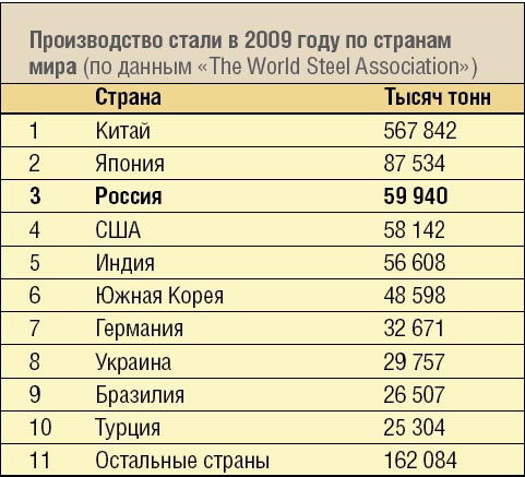 Объем производства железной руды в России, по данным Госкомстата, упал в 2009 году на 8,1% до 92 миллионов тонн, производство стали снизилось до 59,9 миллиона тонн, что составляет около 6% мирового производства. Для сравнения: в докризисном 2007 году у нас добывалось 316,2 миллиона тонн железной руды и выплавлялось 72,3 миллиона тонн стали. При этом на экспорт было отправлено 37,25 миллиона тонн (более 62% производства), что с учетом импорта дает совершенно мизерную цифру внутреннего потребления черных металлов 26,29 миллиона тонн, или чуть больше 185 кг на душу населения.
