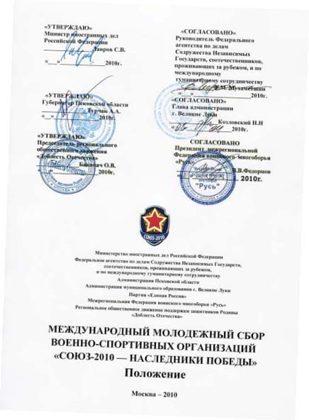 Хочется поблагодарить всех неравнодушных людей, которые оказали содействие при проведении Сбора «Союз 2010». Это тренера и представители команд участниц Сбора, которым порой приходилось преодолевать серьезные препятствия для прибытия к месту проведения сбора; это представители СМИ, которые с энтузиазмом отозвались на просьбу осветить уникальное мероприятие. Отдельное спасибо псковской администрации и губернатору Турчаку Андрею Анатольевичу, главе администрации г. Великие Луки Козловскому Николаю Николаевичу и депутату городской Думы Павлюку Игорю Евгеньевичу.