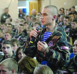 Парни из Рязанского казачьего кадетского корпуса имени генерала армии Скобелева, используя три огромных флага разных цветов, маршируя по сцене, составляли зрелищные композиции. Кадеты из Курганинского казачьего кадетского корпуса Краснодарского края вышли на сцену в традиционных костюмах. Ребята из Дагестанского кадетского корпуса города Махачкалы вышли на сцену в национальных костюмах и сплясали горячий кавказский танец лезгинку! Динамичную программу, наполненную элементами рукопашного боя, показал военно‐спортивный клуб «Олимп» из Курска.