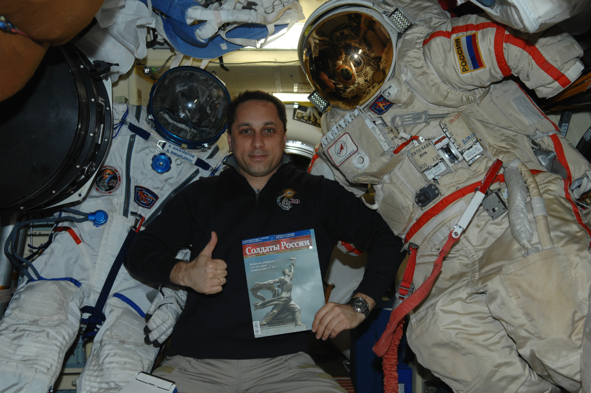 В прошлом году 14 ноября в 08.14.04 по московскому времени вместе с экипажем транспортного корабля «Союз ТМА-22» в составе Антона Шкаплерова, Анатолия Иванишина и Дэниела Бербэнка в космос полетел журнал «Солдаты России». В день празднования 10 -летия журнала членом редколлегии журнала летчиком космонавтом Салижаном Шариповым было организовано прямое включение с орбиты и все присутствующие услышали теплые слова поздравления в адрес журнала «Солдаты России». Все время нахождения 30-й основной экспедиции во главе с командиром Дэниелом Бёрбэнком (НАСА) и бортинженерами Антоном Шкаплеровым и Анатолием Иванишиным в космосе редакция пристально следила за разворачивающими событиями, и радостно приветствовала успешное завершение экспедиции и приземление.