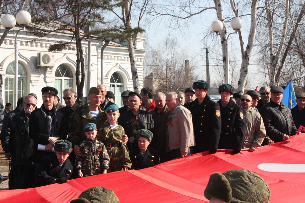 — Уссурийцы, я рад вас приветствовать! У нас многовековая славная история. Нам всем есть чем гордиться. В разные эпохи наши предки защищали Родину и верно ей служили. Мы не забываем эти героические страницы истории. И русский воин, будь то витязь, советский солдат или современный «вежливый человек», всегда будет внушать ужас врагам нашего Отечества и служить своему народу верной защитой. Наш автопробег пройдет по большинству городов России. В городе Владимире пять автоколонн - пять лучей звезды встретятся 5 мая, чтобы затем принять в Москве в День Победы принять участие в акции «Бессмертный полк». Наши активисты пойдут в голове колонны и понесут Знамя Победы, — с гордостью сказал Павел Евгеньевич.