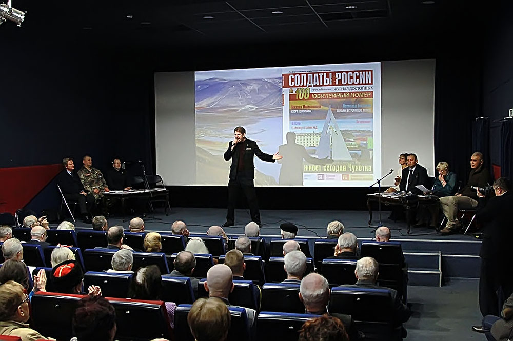 Кинозал Дома журналистов едва смог вместить всех желающих принять участие в обсуждении тем затронутых в журнале. Главной темой номера стала Чукотка. Благодарим администрацию г. о. Эгвекинот и Чукотскую Торговую компанию за предоставленную возможность создать уникальный номер журнала «Солдаты России» под знаковым номером 100.