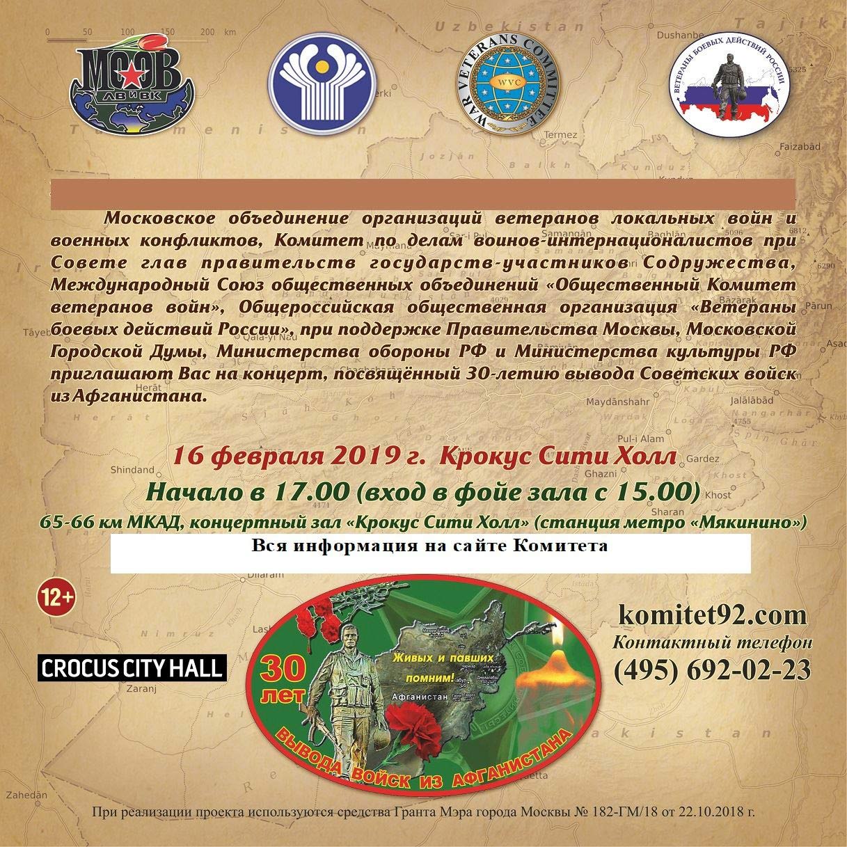 16 февраля в Крокус Сити Холл в 17.00 состоится концерт, посвящённый 30-летию вывода Советских войск из Афганистана.