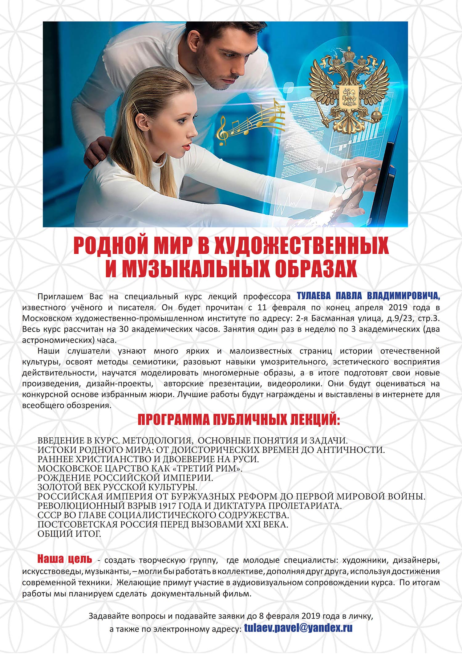 Приглашем Вас на специальный курс лекций профессора ТУПАЕВА ПАВЛА ВЛАДИМИРОВИЧА, известного учёного и писателя. Он будет прочитан с 11 февраля по конец апреля 2019 года в Московском художественно-промышленном институте по адресу: 2-я Басманная улица, д.9/23, стр.3. Весь курс рассчитан на 30 академических часов. Занятия один раз в неделю по 3 академических (два астрономических) часа.