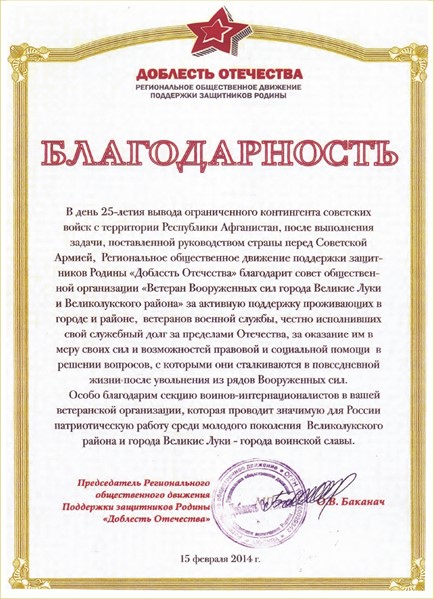 Региональным общественным движением поддержки защитников Родины «Доблесть Отечества» (председатель Баканач О. В.) и информационно-аналитическим журналом «Солдаты России» (генеральный директор Анна Баканач). Это движение и информационно-аналитическое издание в свое время выступили инициаторами проведения молодёжных образовательных сборов военно-спортивных организаций «СОЮЗ – Наследники Победы». Три раза местом проведения таких сборов был выбран город Великие Луки: 2008 год, 2010 год и 2012 год. Представители ветеранской организации капитан МВД в отставке Синельников Р.Б. и подполковник запаса Павлюк И.Е. участвовали в подготовке этих сборов и подготовке команды города Великие Луки к участию в соревнованиях на этих сборах.
