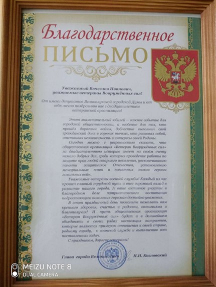 За совместную деятельность с руководством города Великие Луки и этими общественными объединениями ветеранская организация «Ветеран Вооруженных сил» и активные ветераны были награждены руководством города и руководством этих общественных объединений специальными наградами и грамотами. Подробная информация об этом изложена в книге «Служим Отечеству».