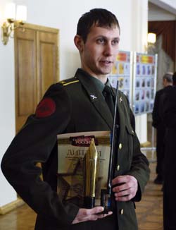 От имени нашего журнала, который вот уже шесть лет тесно сотрудничает с кафедрой журналистики Военного университета (руководитель полковник Владимир ЛАРЧЕНКОВ), победителям творческого конкурса были вручены денежные премии и дипломы. Первое место в конкурсе занял курсант Евгений МИХЕЕВ, второе – курсант Александр ЛЕНИН и третье – курсант Сергей БОГРАД.