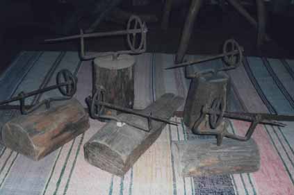 Одной из важных деталей станка является челнок с берестяной чивцой, на которой намотана уточная нить. На чивцу пряжу наматывают с тюриков, при этом используют скально.