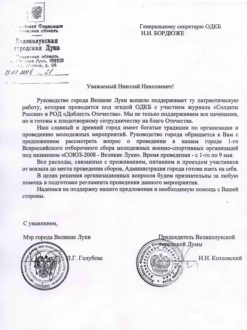Отборочный сбор "Союз-2008 - Великие Луки" был проведен с 1 по 9 мая. Выявлены участники II-й международного сбора молодёжных военно-спортивных организаций стран участниц ОДКБ
