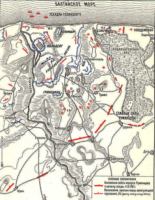 А первой самостоятельной операцией Румянцева стала осада Кольберга в 1761 году. 5 декабря во главе корпуса численностью 15 тысяч человек он заставил капитулировать одну из наиболее мощных в Европе