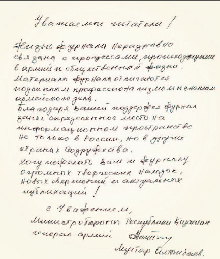От имени редакционной коллегии журнала желаю Вам и военнослужащими казахстанской армии всяческих успехов!