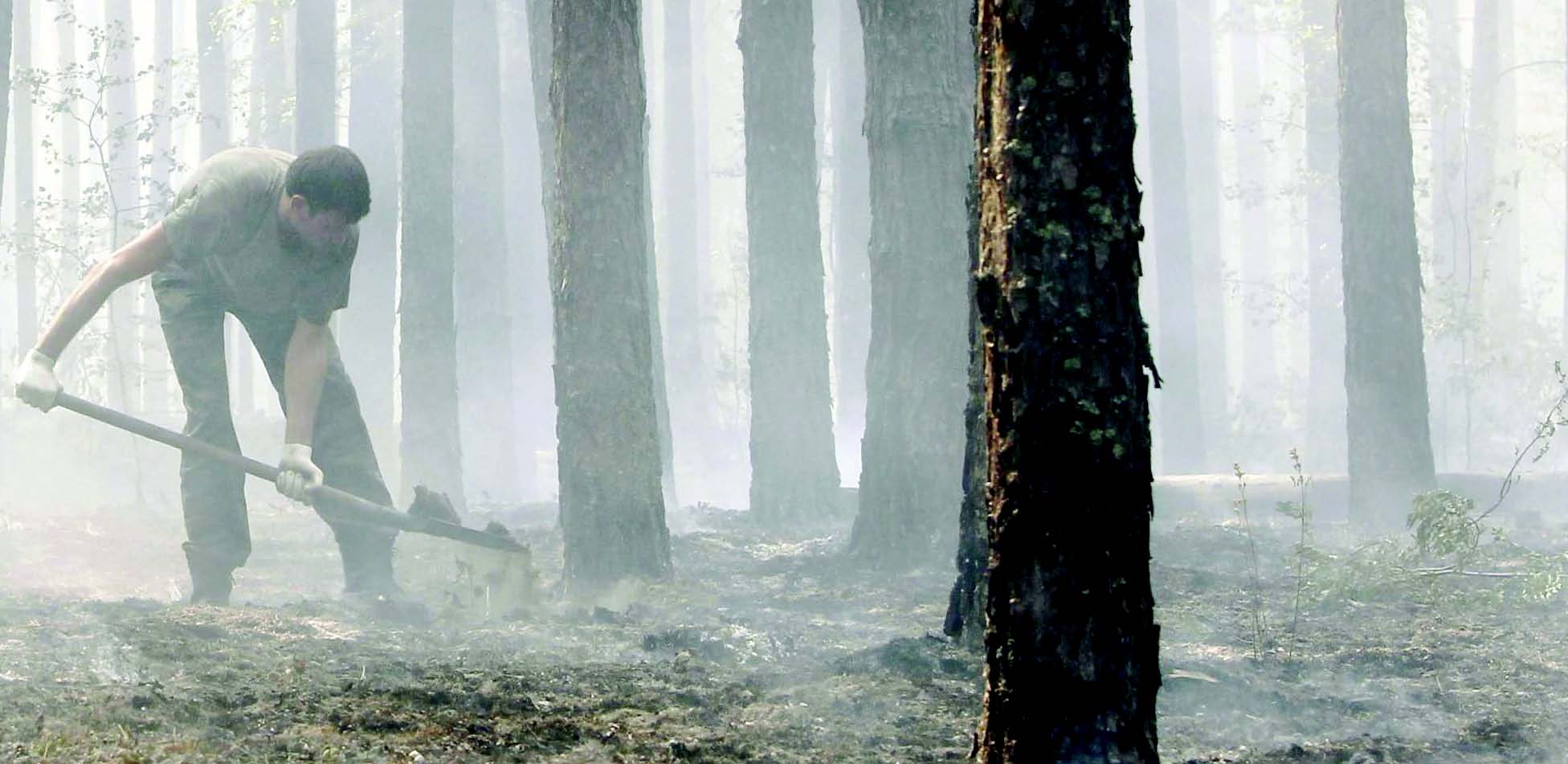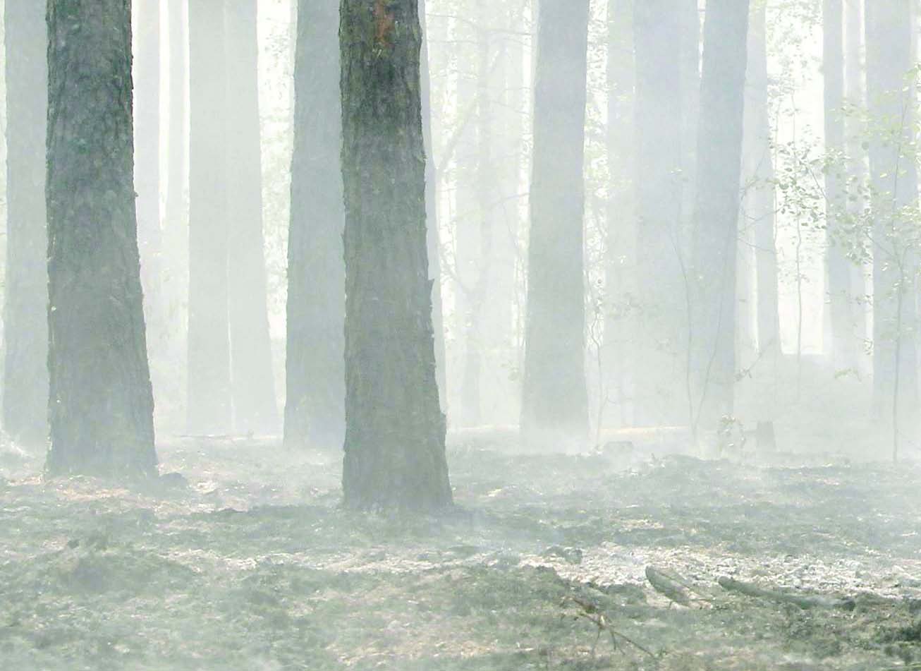 В лесу почти нет открытого огня, но от земли пышет жаром. Подстилка раскалена (жар чувствуется порой даже через толстые подошвы «берцев»). Торфа, к счастью, почти нет, но подстилка довольно мощная, до песка далеко. Кромку приходится окапывать и проливать большим количеством воды. Особенно тщательно приходилось проливать деревья.