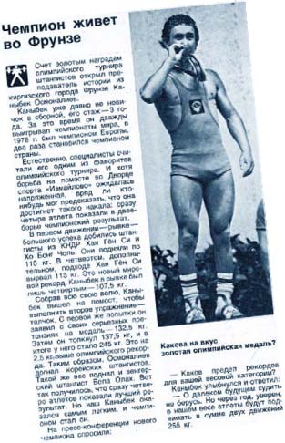 В 1974 году я стал мастером спорта. На следующий год я стал чемпионом Советского Союза среди молодежи и в этом же году закончил университет. Моя дипломная работа (она была написана на русском языке) называлась «Зарождение и развитие тяжелой атлетики в Киргизском государственном университете». Мой научный руководитель высоко оценил работу. Я привел данные о зарождении тяжелой атлетики в Советском Союзе. Оказывается, до меня никто из студентов не использовал в таком объеме архивные материалы, касающиеся всей страны, а не только университета.