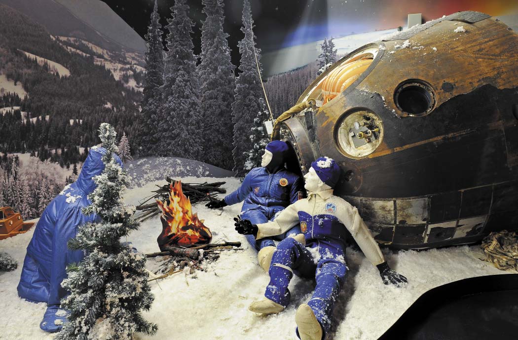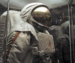 Скафандр оранжевого цвета, поскольку так спасатели смогут быстрее обнаружить космонавта после посадки. А рядом находится шлюзовая камера, через которую Алексей Леонов совершил первый выход в открытый космос, и скафандр «Беркут», который был на нем надет.