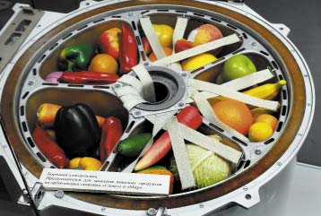 А вот космическая оранжерея. Еще Циолковский в своих мечтах говорил о необходимости оранжерей в космосе, которые могли бы обеспечить людей продуктами питания и поглотить отходы.