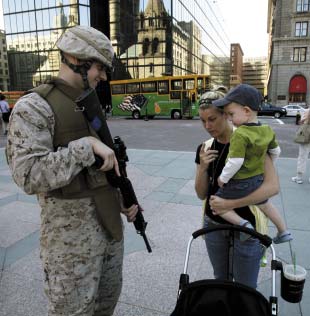 Первая «Неделя морской пехоты», проведенная в Бостоне в начале мая, дала старт принципиально новой призывной кампании США. «День призывника», многократно повторенный морскими пехотинцами в течение недели на центральных площадях города, собрал тысячи мальчишек и девчонок(!), их родителей с бабушками и дедушками вокруг сверкающих настоящих боевых «Хаммеров», БТРов и гигантских гаубиц. Роскошные винтовки и автоматы с оптическими прицелами сами ложились в ладони счастливых подростков.