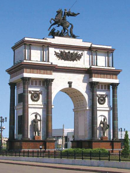 Триумфальные ворота в Курске, являющиеся частью мемориального комплекса «Курская дуга», стали первой в мире триумфальной аркой, построенной в честь победы над нацистской Германией. Высота монумента 24 метра.