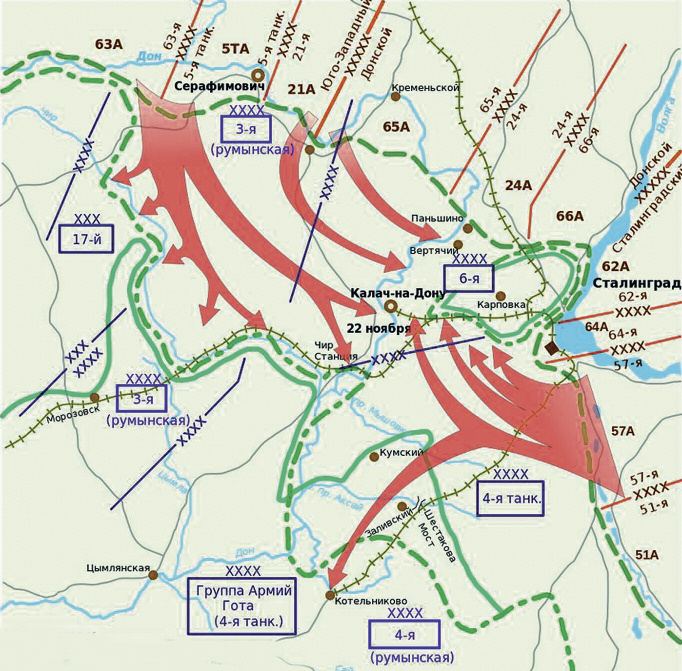 Если попытаться спроецировать его на наше время, то это все равно что посадить целую дивизию со всем вооружением на вертолеты, перевезти по воздуху через непроходимую местность в тыл противника и снабжать ее тоже по воздуху. Так что если удар в районе Клетской и Серафимовича немцы хотя бы предполагали (пусть и сильно ошиблись с его мощью), то удар из степей к югу от Сталинграда был полной неожиданностью.