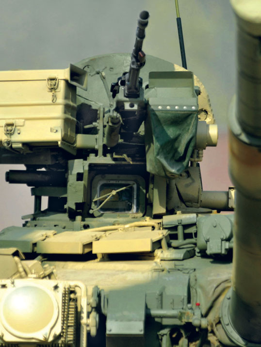 Другая новинка, тоже для боёв в городских условиях созданный специально в экспортном варианте комплекс активной защиты «Арена-Э». В СССР, а если точнее, именно в России, в Коломенском КБ машиностроения, под руководством генерального конструктора Сергея Павловича Непобедимого в 1980-х годах впервые в мире разработали систему защиты, обеспечивавшую гарантированное уничтожение кумулятивных гранат и управляемых реактивных снарядов на подлете к танку. Называлась она «Арена». Потом разработали системы, сбивавшие все летящие к танку поражающие элементы, в том числе подкалиберные сердечники бронебойных снарядов.