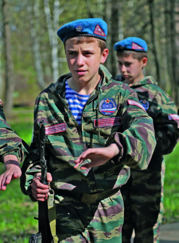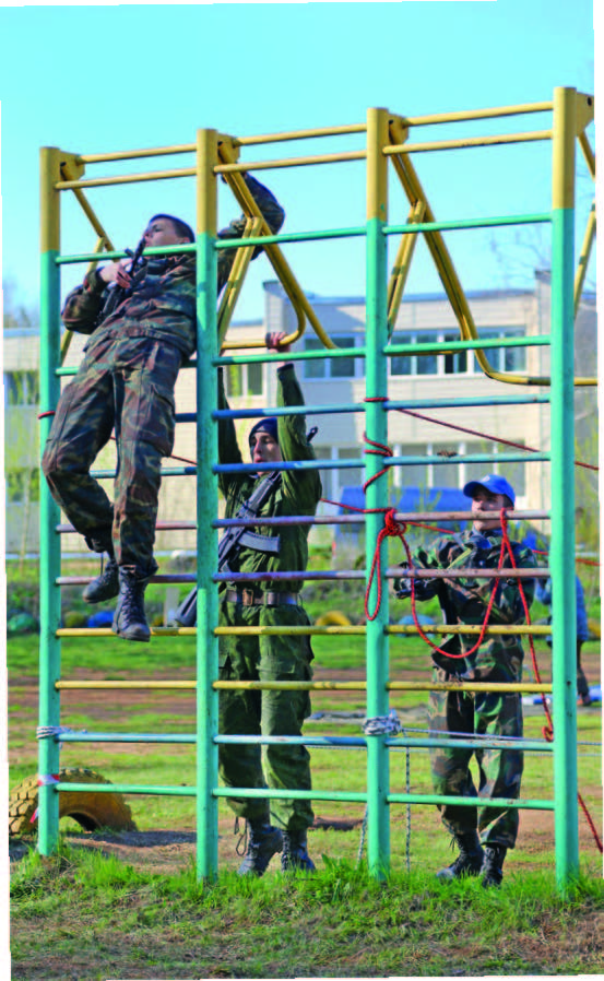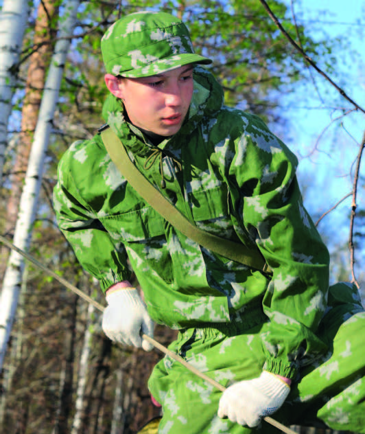 Затем ребят ждала небольшая поляна со множеством веревочных снарядов. Участникам предстояло преодолеть «бабочку», растянутую на двух деревьях, залезть по верёвочной лестнице на верхушку небольшого дерева и спрыгнуть на землю, пройти веревочную лестницу, растянутую над землёй, не задев колокольчик, привязанный к верёвке, пролезть в чрезвычайно узкую щель, образованную несколькими верёвками, и затем переползти по веревке, используя только руки и ноги, с одного дерева на другое. На себе ребята несли оружие либо