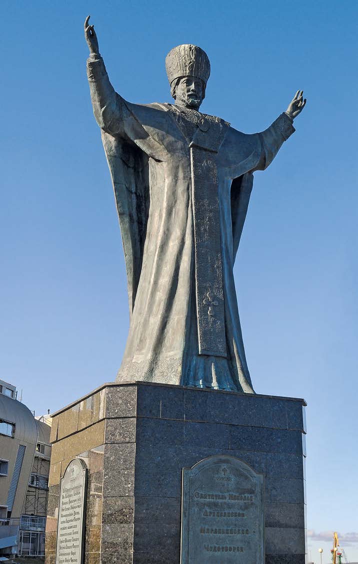 До посещения Чукотки я был уверен, что самый большой памятник покровителю русского мира, одному из самых почитаемых святых в России, все-таки находится на одном из Курильских островов в Тихом океане, на том острове, который ближе всего к Японии. Того Чудотворца вертолетом доставил на Курилы генерал-лейтенант авиации Герой России Николай Федорович Гаврилов. Заступник смотрит на Японию – а за спиной вся Россия! В этом есть, наверное, особый какой-то символизм…