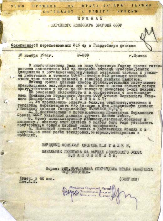 Впрочем, формировалась дивизия действительно в столицах двух республик – Фрунзе и Алма-Ате. И, по официальной информации, состояла она поровну из кыргызов и казахов (и тех, и других – по 11 процентов). Костяк же дивизии (67 процентов) составляли русские. Учитывая, что 8 процентов отводилось украинцам, ещё 3 процента – представителям других национальностей, Панфиловскую дивизию смело можно назвать интернациональной. И в этом смысле она – ярчайший пример того, как Великая Отечественная война соединила, сплотила, спаяла (казалось – намертво) все большие и малые народы, населявшие огромную державу.