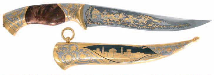 Тема авторского ножа «Тамерлан» навеяна богатейшим культурным наследием народов Востока. Изысканно украшенный нож олицетворяет власть, успех и процветание владельца. В равной степени нож достоин занять место как в коллекции художественного оружия, так и на поясе знатного охотника.