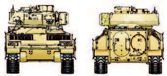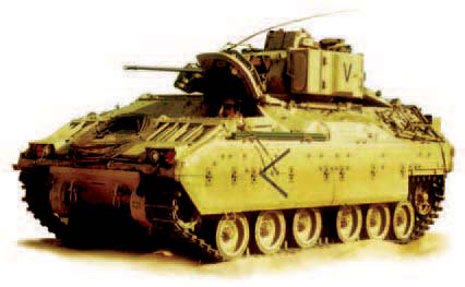 БМП М2 и БРМ М3 «Бредли» первых модификаций оказались довольно уязвимыми от огня иракских РПГ-7 и ПТРК. На модернизированны машинах М2А2 и М2А3 (с 1988 г.) установлена динамическая защита (активная броня), при- званная уменьшить пробивную способность кумулятивных боеприпасов РПГ и НАР На каждой БМП М3А2 (БРМ М3А2) крепятся 43 элемента динамической защиты размером 305х457х50,8 мм (на бортах и лобовой части корпуса), образуя сплошные панели (фото вверху).