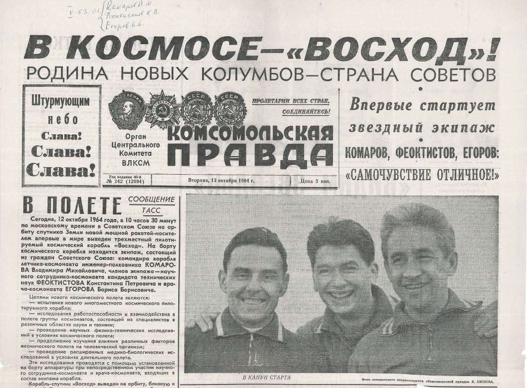В этом полете всё было первым. Первый в мире космический экипаж. С тех пор на орбиту поодиночке почти не летали, только командой. Первые гражданские космонавты. Инженер «королёвского» КБ — Константин Феоктистов. Он же один из конструкторов космических кораблей, который лично испытал своё «детище». Первый врач Борис Егоров. Командир — Владимир Комаров — военный лётчик, но с инженерным академическим образованием. Это было первое космическое путешествие, где проводились полноценные медицинские эксперименты.