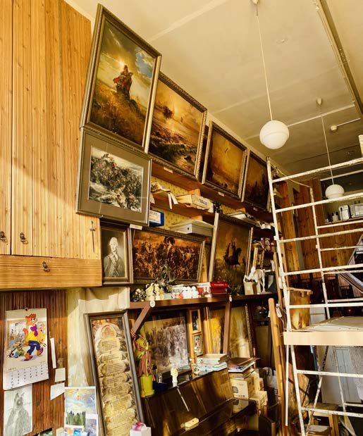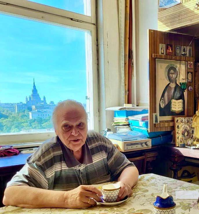 В таком виде мы и застали картину, находясь в святая святых — мастерской художника. Не случайно Вячеслав Михайлович обращался в своём творчестве к теме Веры и становления Духа. На всех стенах в мастерской — иконы. Евгения Николаевна Назарук, с которой Вячеслав Михайлович прожил шестьдесят лет, рассказала, что он всегда был верующим человеком. В мастерской горела лампада, и Вячеслав Михайлович сам её зажигал и каждый день начинал с утренней молитвы.
