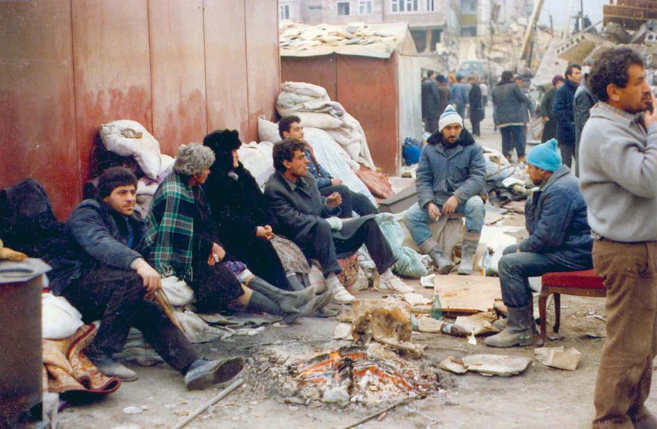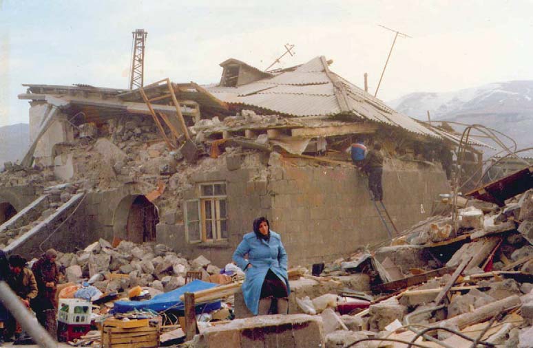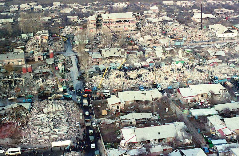 На штабном «уазике» выехали на тёмные улицы Ленинакана. Через мокрое лобовое стекло было заметно, как по бетонному крошеву разрушенных домов ползают серые фигурки спасателей. В лучах прожекторов мощные стрелы подъёмных кранов, плиты, арматура, пыль. Почти у каждого дома штабелями пустые гробы: красные и чёрные.