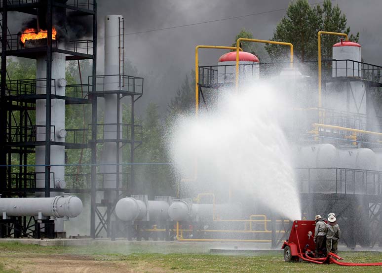 Химики заняты заделкой протечки в емкости и дезактивацией зараженного участка.