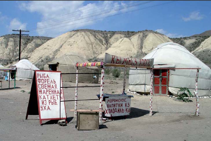 Там стоят юрты люди в национальных одеждах, не ряженые, а вполне аутентичные местные жители зазывают за стол отведать бешбармак, плов, форель. Можно покататься на лошади, на ишаке.