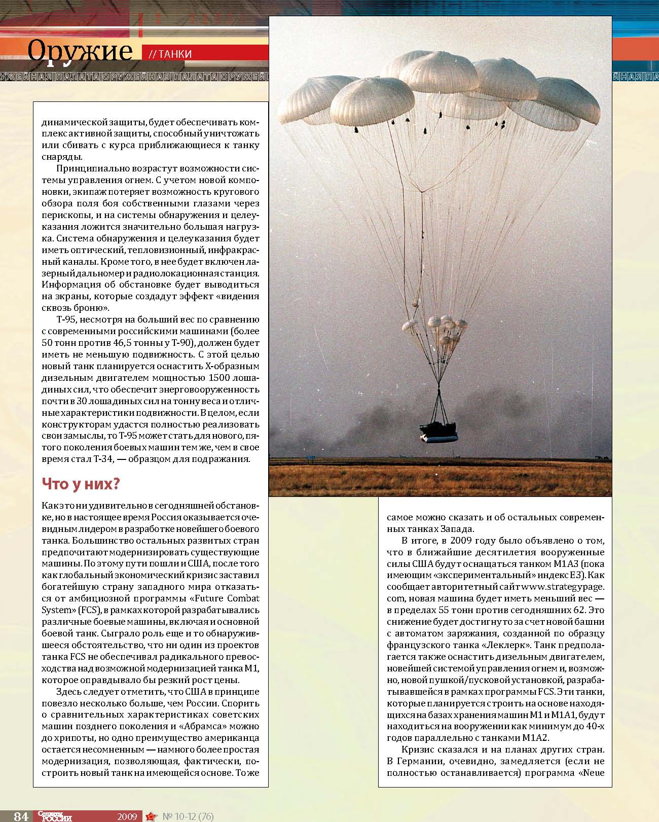 Как это ни удивительно в сегодняшней обстановке, но в настоящее время Россия оказывается очевидным лидером в разработке новейшего боевого танка. Большинство остальных развитых стран предпочитают модернизировать существующие машины. По этому пути пошли и США, после того как глобальный экономический кризис заставил богатейшую страну западного мира отказаться от амбициозной программы «Future Combat System» (FCS), в рамках которой разрабатывались различные боевые машины, включая и основной боевой танк. Сыграло роль еще и то обнаружившееся обстоятельство, что ни один из проектов танка FCS не обеспечивал радикального превосходства над возможной модернизацией танка М1, которое оправдывало бы резкий рост цены.