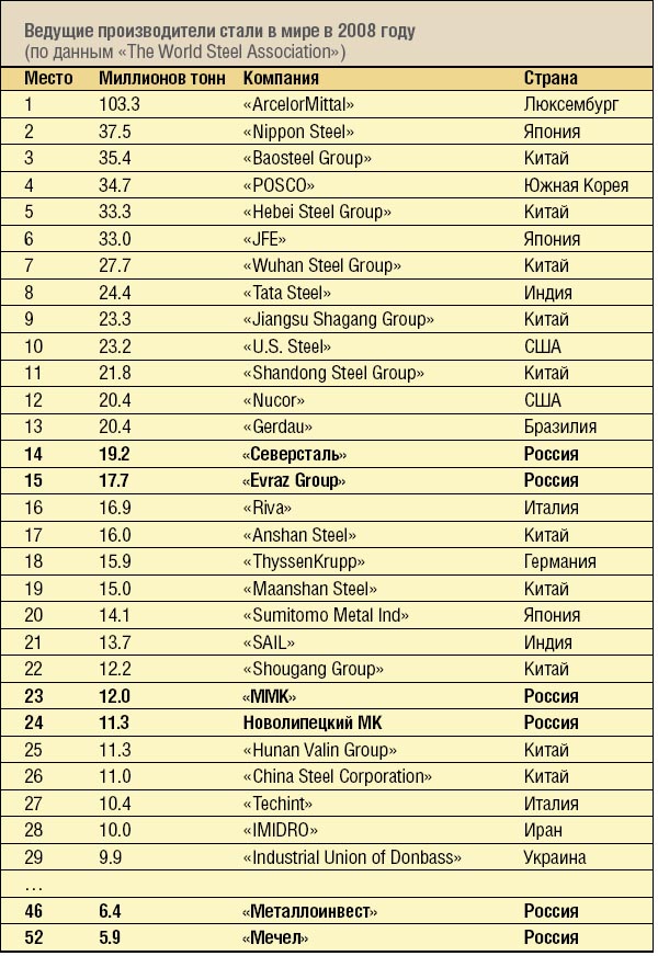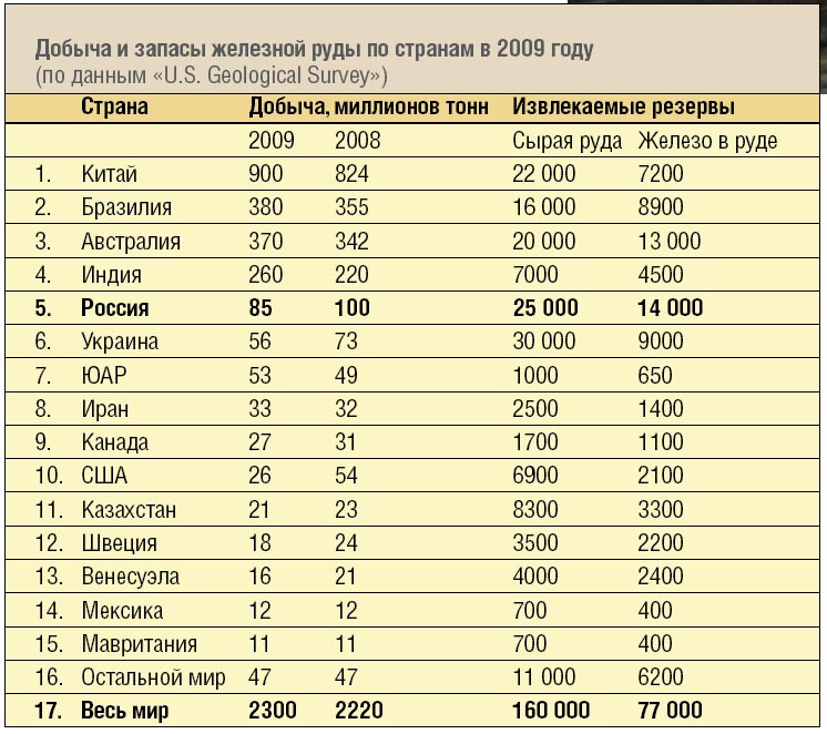 Объем производства железной руды в России, по данным Госкомстата, упал в 2009 году на 8,1% до 92 миллионов тонн, производство стали снизилось до 59,9 миллиона тонн, что составляет около 6% мирового производства. Для сравнения: в докризисном 2007 году у нас добывалось 316,2 миллиона тонн железной руды и выплавлялось 72,3 миллиона тонн стали. При этом на экспорт было отправлено 37,25 миллиона тонн (более 62% производства), что с учетом импорта дает совершенно мизерную цифру внутреннего потребления черных металлов 26,29 миллиона тонн, или чуть больше 185 кг на душу населения.