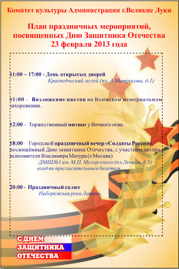 В центральном музее Великой Отечественной войны 194145гг. на Поклонной горе проходят праздничные мероприятия посвященный 23 февраля Дню Защитников Отечества. 21 февраля в Художественной галереи открылась выставка работ студентов, преподавателей и выпускников Российской Академии живописи, ваяния и зодчества им. Глазунова.