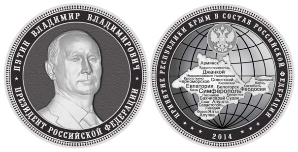Всего в коллекцию войдут 25 серебряных и позолоченных монет весом 1 килограмм и размером с ладонь. Первую из них представят 23 апреля. На реверсе монеты будет изображен контур Крымского полуострова с названиями 28 местных городов, а на аверсе барельеф президента России Владимира Путина. Идея создания подобной монеты принадлежит генеральному директору предприятия Владимиру Васюхину.
