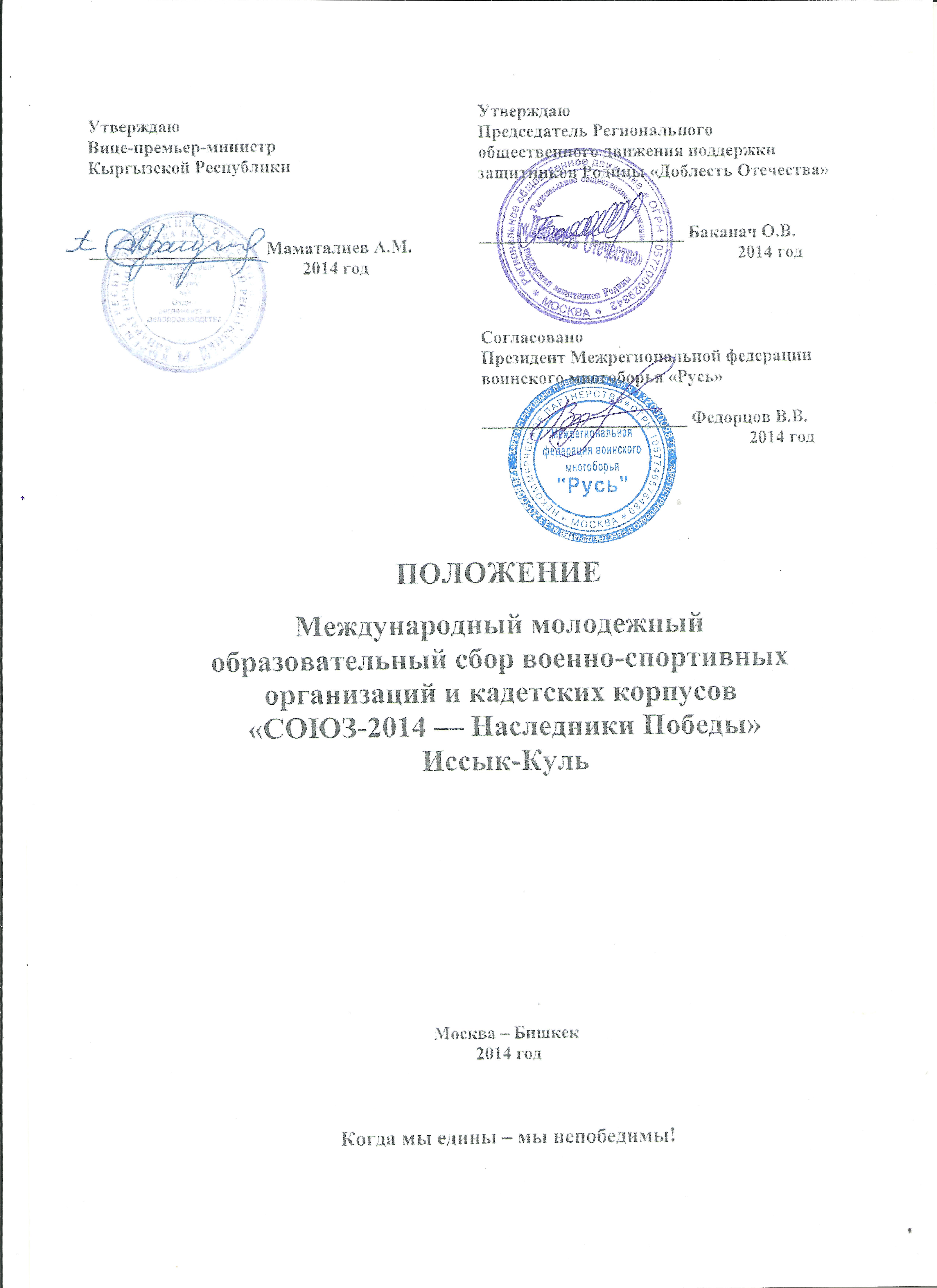 Состоялось подписание Положения о проведении в августе 2014 года в Кыргызстане на озере Иссык-Куль Международного молодежного образовательного сбора военно-спортивных организаций и кадетских корпусов «СОЮЗ 2014 Наследники Победы» Иссык-Куль.
