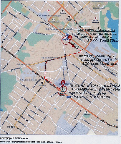 Приглашаю прибыть в город Раменское к 10.00 8 мая на улицу “Десантная” (платформа “Фабричная” Рязанского направления Московской ж/д, смотри схему) ВСЕХ СЛУЖИВШИХ В ВДВ И СПЕЦНАЗЕ, КТО ВЕРЕН ДЕСАНТНОМУ БРАТСТВУ, КТО ЛЮБИТ И ВЕРИТ НАСТОЯЩИМ ЗАЩИТНИКАМ ОТЕЧЕСТВА!!